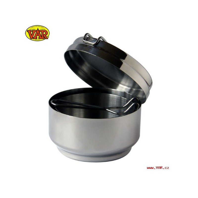 Klasický trojdílný nerezový ešus, jedna větší a jedna menší nádoba a poklice/pánev. Sklopné držadlo.