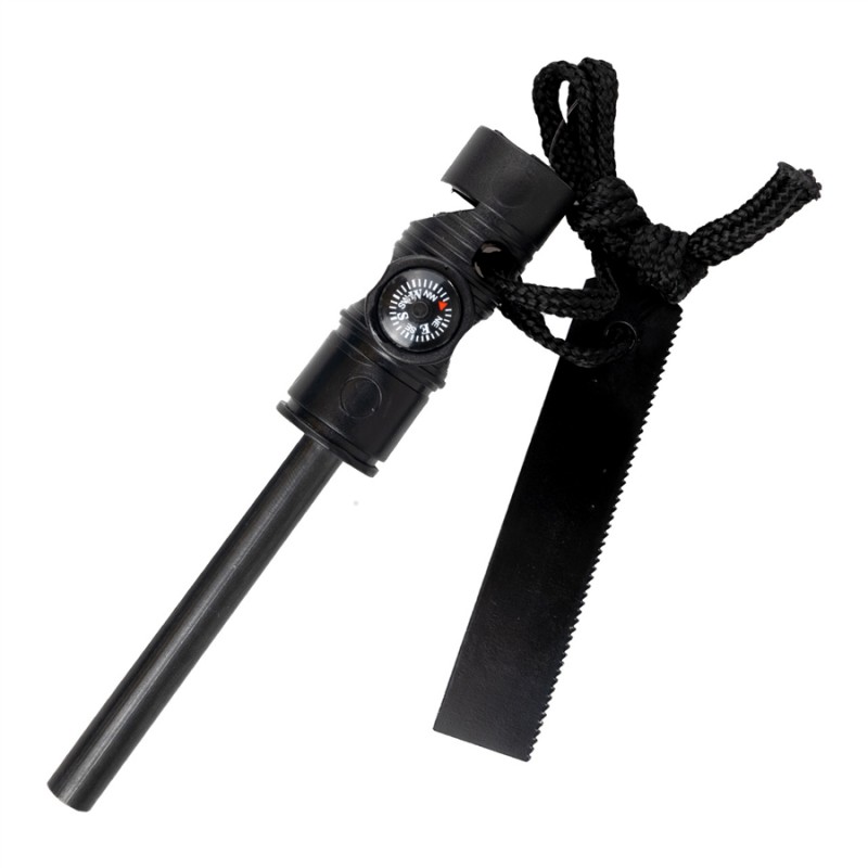 Křesadlo 3 v 1. Pomůcka pro přežití v přírodě. Křesadlo vyrábí velké jiskry a rychle zapálí suchou trávu nebo troud. Před prvním použitím je nutné z tyčky škrtadlem seškrábat černou barvu. Kompas pro orientaci v terénu a píšťalka pro přivolání pomoci.