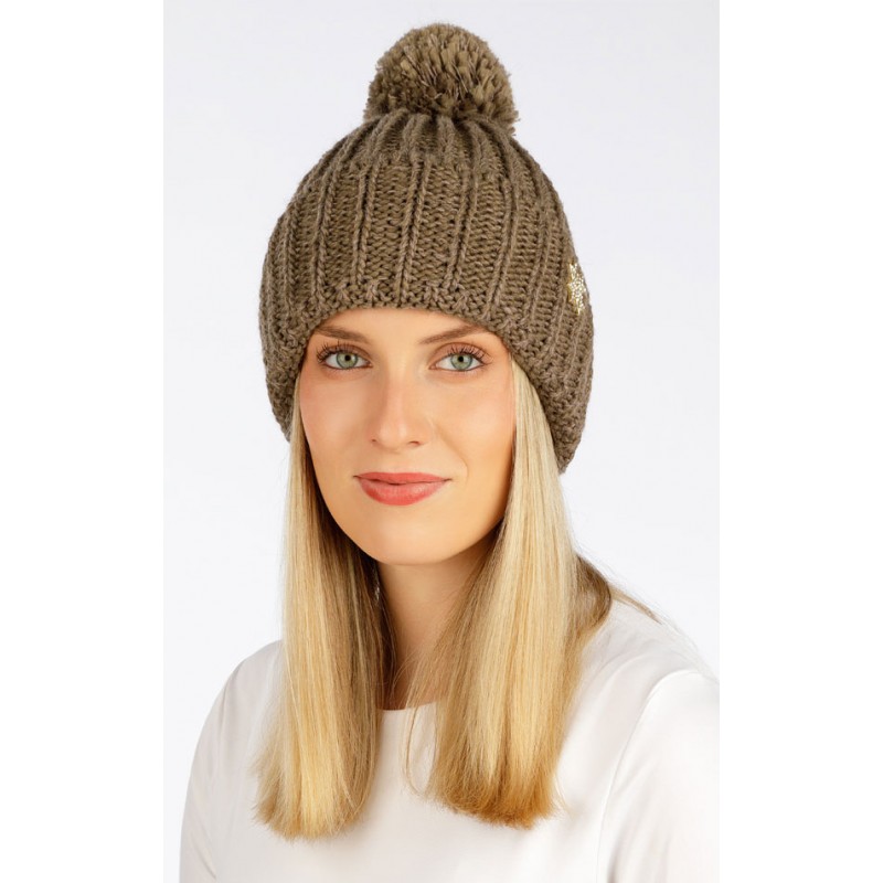 Dámská pletená čepice Litex 7F405 s bambulí. Čepice s hrubým vzorem s příměsí vlny a ozdobou ve tvaru zlaté vločky s kamínky. Uvnitř čepice je všita čelenka z fleecu. Velikost UNI.