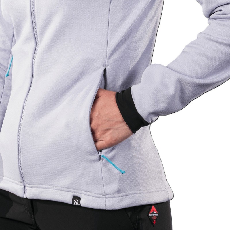 Dámská fleecová mikina Northfinder ANGELES je lehká, měkká a pružná s úpravou antipilling, takže i po mnoha praních nežmolkuje. Vnitřní grid struktura zlepšuje odvod potu - pot se rychle rozlévá po povrchu a mikina rychleji schne, takže se po výstupu necítíš mokrý a prochladlý. Přídavek elastanu dává volnost pohybu při chůzi, výstupu i při běžném nošení. Praktický stojáček chrání krk. Dvě boční kapsy se zapínáním na zip. Spodní okraj mikiny se stahováním a okraje rukávů mají pružný lem. Reflexní prvky.